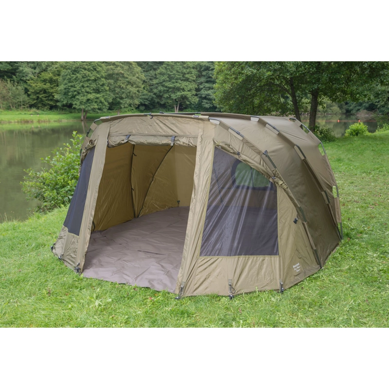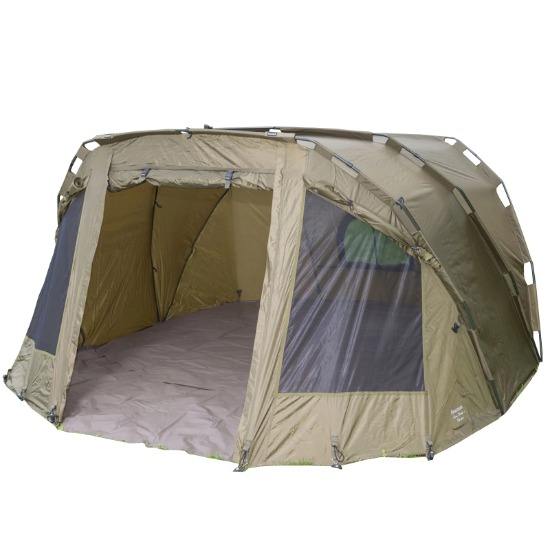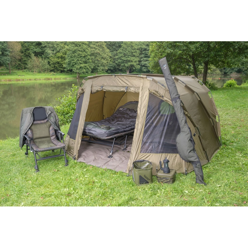 Lehký a stabilní multifunkční bivak s moskytiérovými okny, průhlednou slídou a možností rychlé úpravy pro jednoho nebo dva rybáře.
