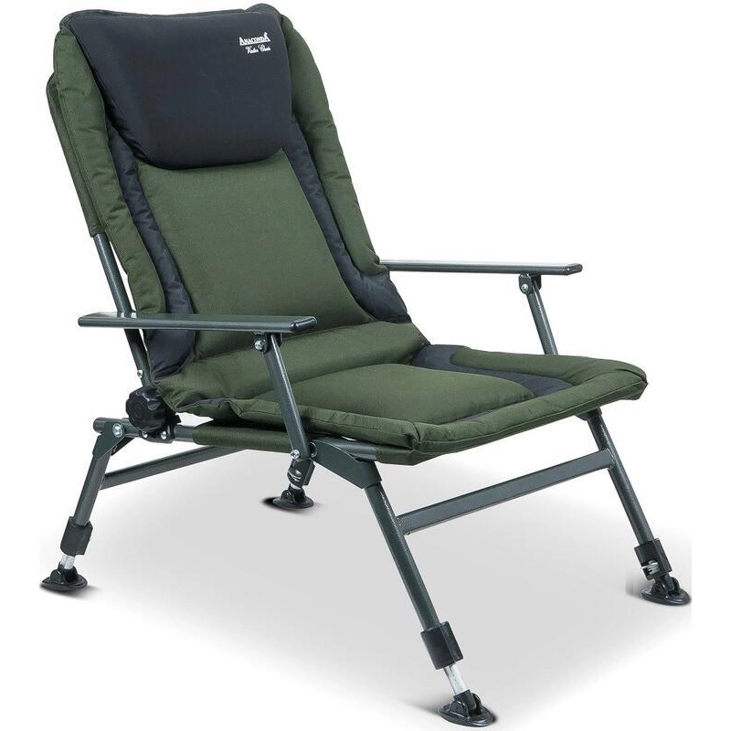 Praktické rybářské křeslo z voděodolného 600D polyesteru s polstrováním a plynule nastavitelnými nohami proti zaboření.