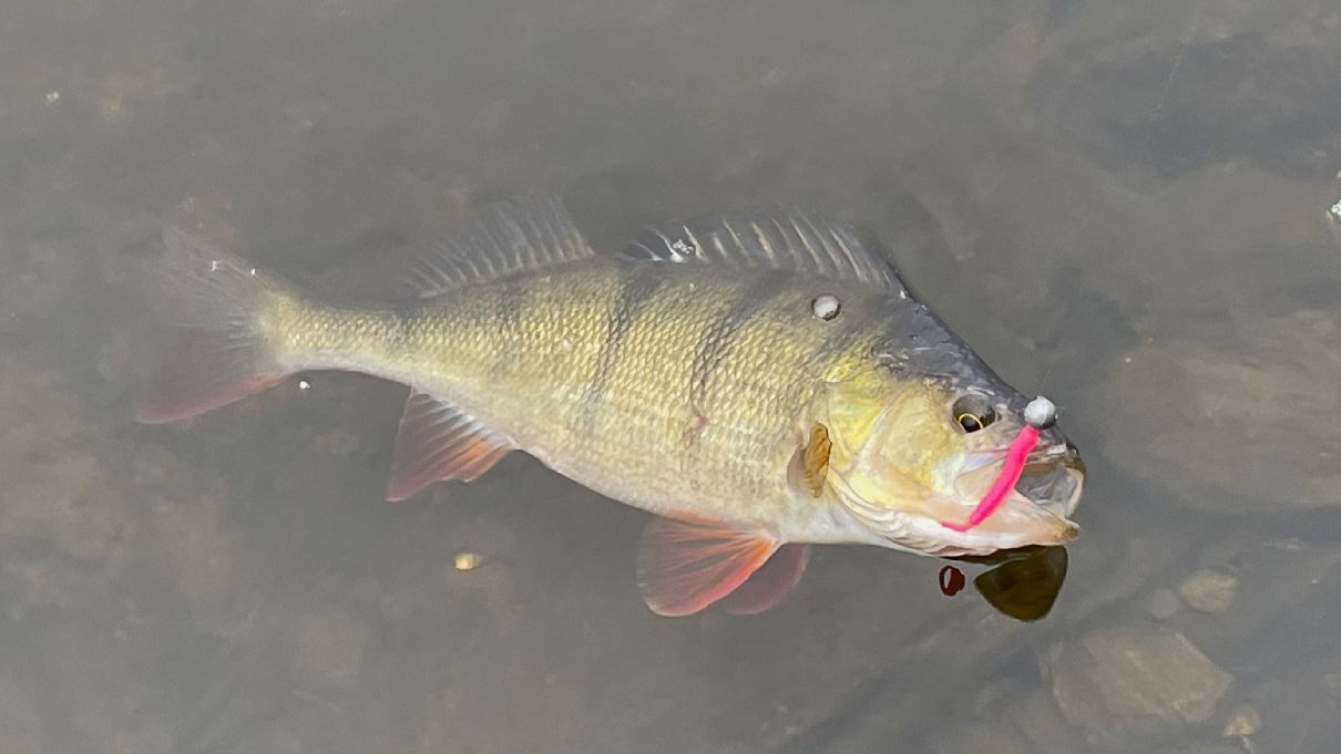 Krásný okoun se nechal zlákat na nástrahu ve tvaru červa
