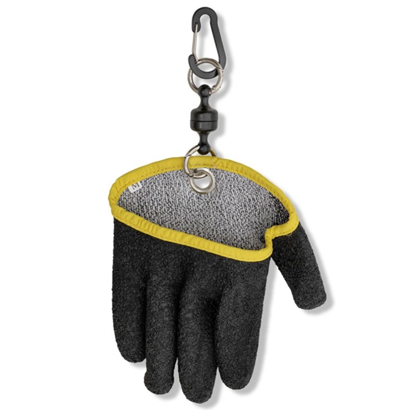 Speciální vylovovací rukavice z robustního gumového materiálu, magnetickým klipem a fixační karabinou pro upevnění na lodi.