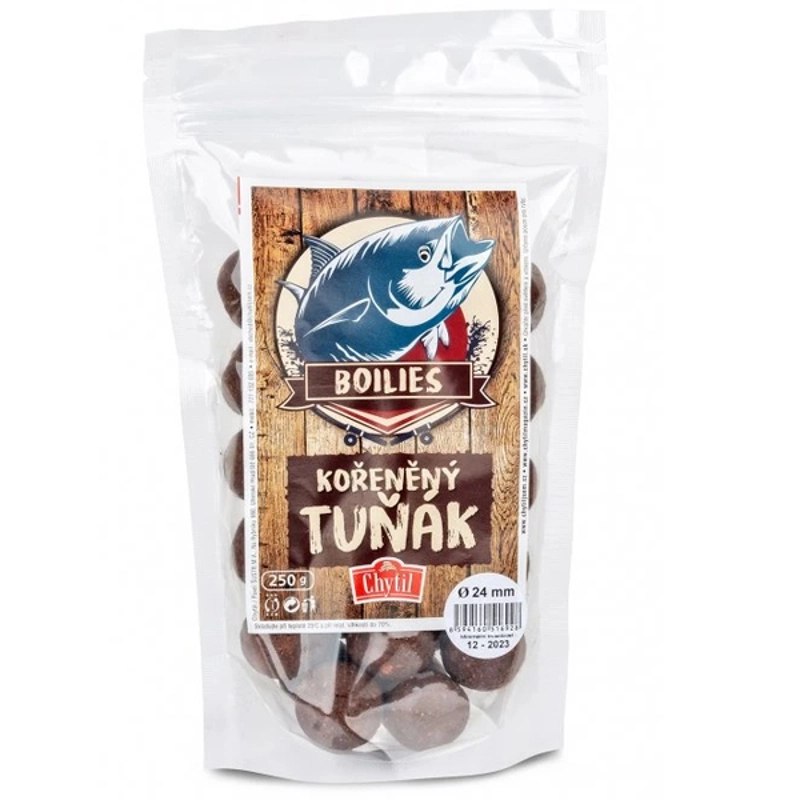 Boilies z tuňákové, lososové a sardinkové moučky s GLM extraktem a kořením, doplněné o výrazné AMK Česnek/Asa Foetida a esenciální olej černý pepř.