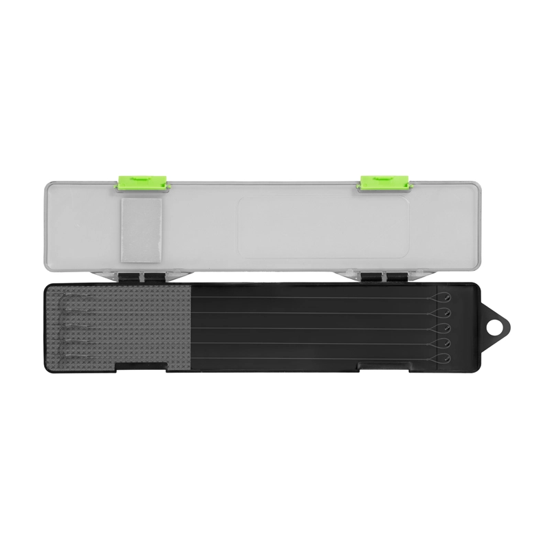 Tělo boxu je vyrobeno z odolného černého plastu, který chrání obsah před mechanickým poškozením. Vnitřek je vybaven plastovými výběžky pro přesné uchycení smyček a měkkou EVA pěnou, do které spolehlivě zapíchnete háčky bez rizika otupení jejich hrotů. Díky délce 216 mm je tento box ideální zejména na kratší návazce používané při lovu technikou method feeder.