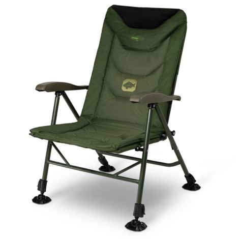 Křeslo ErgoCARP kombinuje pohodlí, nastavitelná opěrky a stabilní konstrukci v zelené barvě s logem Outline.