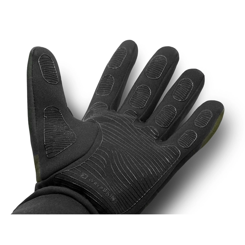 Pro jistou manipulaci s prutem a náčiním je oblast dlaně osazena protiskluzovou pogumovanou vrstvou, která je navíc ozdobena logy značky Delphin. Díky ní získáte stabilní a pevný úchop i ve vlhkém prostředí, což je neocenitelné během dlouhého čekání na záběr. Aby byl chlad a nechtěná voda zcela eliminována, rukavice jsou při zápěstí precizně utěsněny kombinací všité gumy a nastavitelného dotahovacího pásu na suchý zip. Toto promyšlené řešení efektivně brání pronikání chladu a nežádoucí vlhkosti.