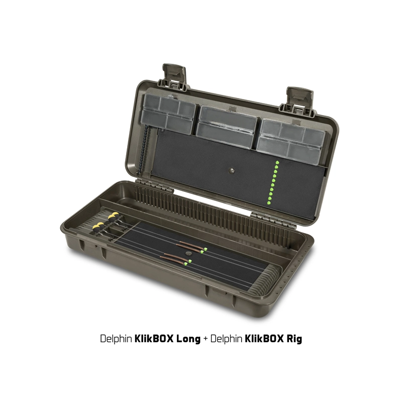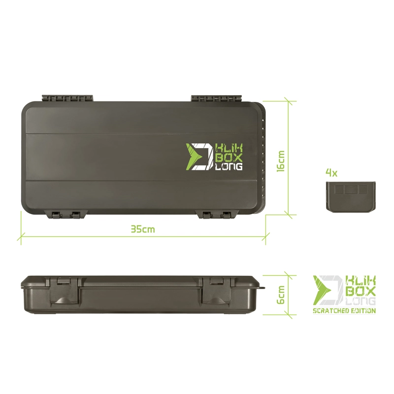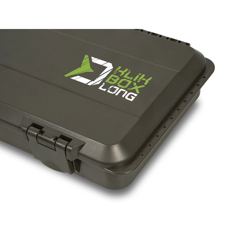 KlikBox Long je navíc vybaven platem z tvrzené pěny a špendlíky pro pohodlné uchycení koncových montáží. Podél celého odkládacího prostoru na návazce naleznete měřítko, podle kterého si budete umět přesně určit délku vašich koncových montáží. Organizér je vyroben z velmi odolného plastu a k jeho komfortnímu otevírání a uzavírání poslouží dva pevné plastové klipy.
