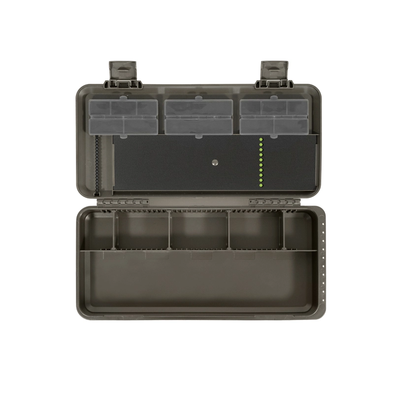 Spodní část organizéru je rozdělena na dvě sekce. První poskytuje největší úložný prostor, ideální pro uložení například utahovače uzlů, jehel, nůžek či jiného příslušenství. Bez problémů se do ní vejde i organizér na návazce KlikBOX Rig, který není součástí balení, ale je možné si jej samostatně dokoupit. Druhá sekce je navíc rozdělena polohovatelnými přepážkami, díky kterým si můžete prostor přizpůsobit přesně podle vašich potřeb.