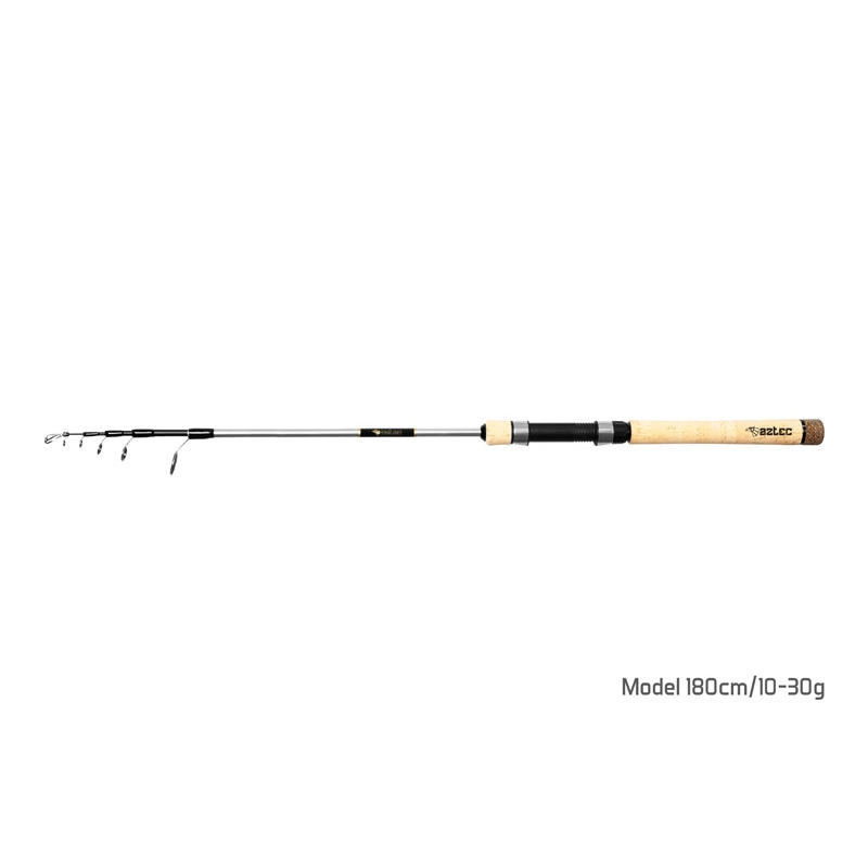Teleskopický prut už dávno neznamená automaticky nižší kvalitu. To dokazuje řada teleskopů AZTEC, která v sobě snoubí kompaktní rozměry při zachované kvalitě komponentů. Využili jsme kvalitní 24T karbon, na kterém je celý prut postaven, použili velmi dobrá očka, pěkný a odolný korek. Kompletní prut tak splňuje všechny kvalitativní požadavky děleného prutu při zachování excelentních kompaktních rozměrů.