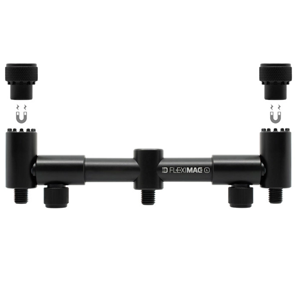 Hrazda na pruty FlexiMAG BUZZ z pevného hliníku s černou práškovou úpravou má magnetické rychlospojky a univerzální závit kompatibilní s většinou vidliček a bouřkových tyčí.