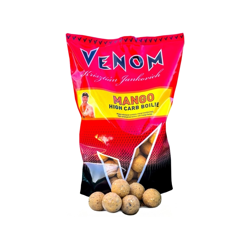 Boilie Venom High Carb s příchutí Mango a o průměru 20 mm se vyznačuje vysokým obsahem sacharidů.