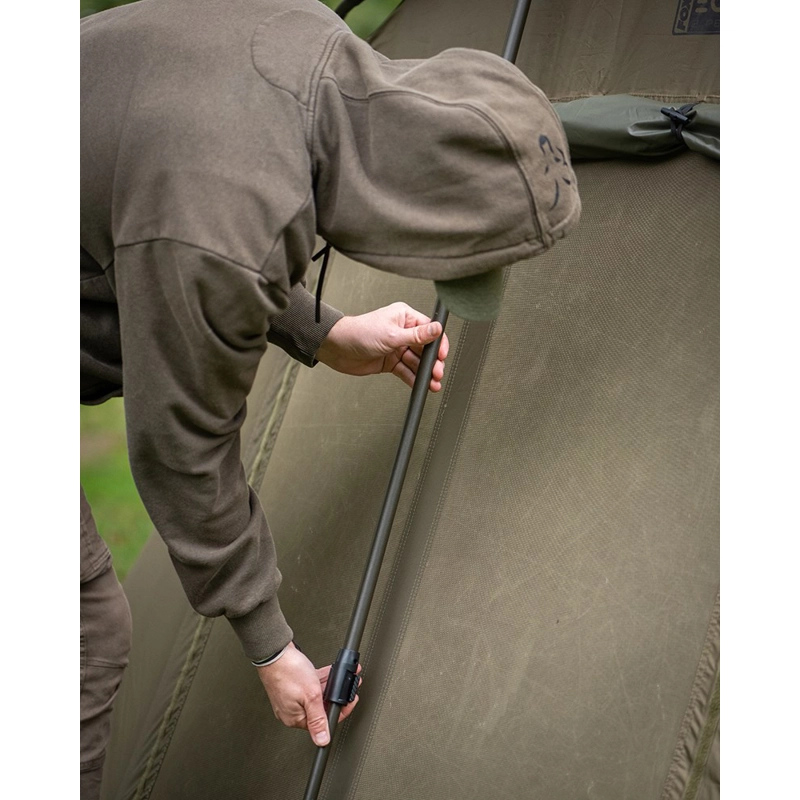 Ideální bivak pro začátečníky nebo rybáře s omezenějším rozpočtem. Vyrobeno z látky s hydrostatickým tlakem 8000 mm a tmavou laminací, která snižuje pronikání světla a udržuje přístřešek v létě chladnější. Dvojitá konstrukce pram-hood se dvěma vzpěrami a větší stříškou než u předchozího modelu pro lepší ochranu. Přední a zadní ventilační otvory proti komárům (po obou stranách dveří) pro zajištění cirkulace vzduchu. Extra široký vstup o šířce 112 cm s dvoucestným otvíráním ve stylu “letterbox” a možností výměny sítí, PVC nebo plných panelů. Přední panel lze odrolovat a vytvořit tak otevřený přístřešek.