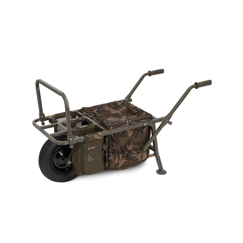 - Součástí vozíku Explorer je středový vak ve vzoru Fox Camo a dvě síťované kapsy u kolečka, ideální pro 5l kanystr a nástrahy.