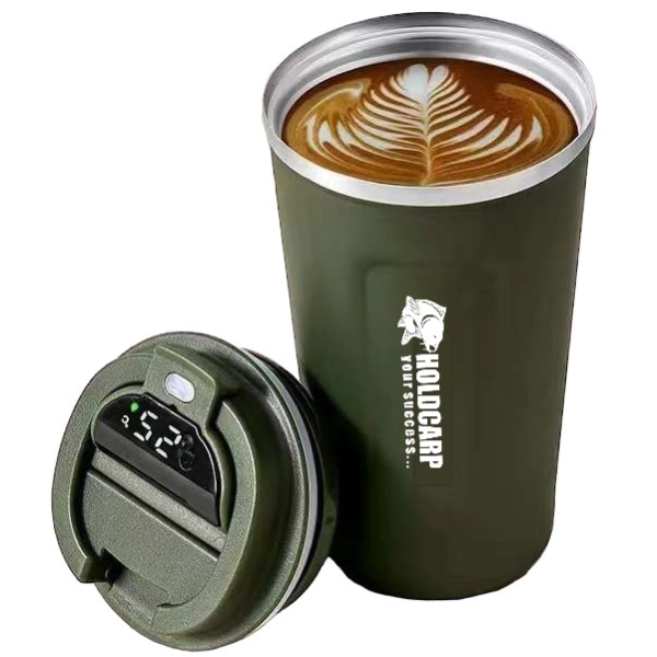 Nerezový termo hrneček o objemu 510 ml, který po dotyku prstem ve vrchní části zobrazí teplotu nápoje, který se nachází uvnitř.