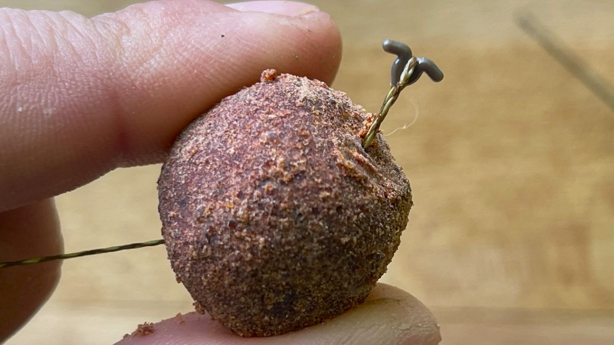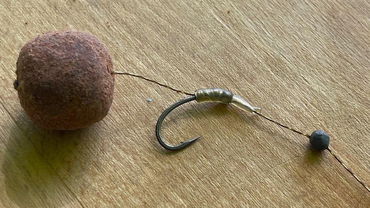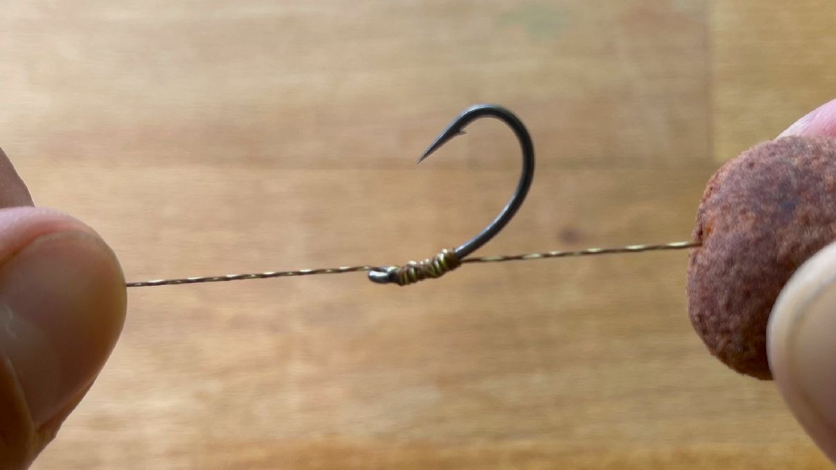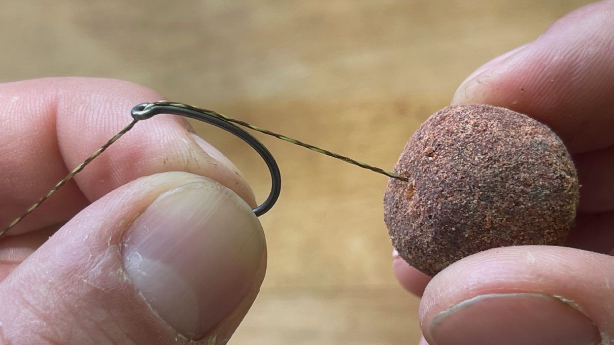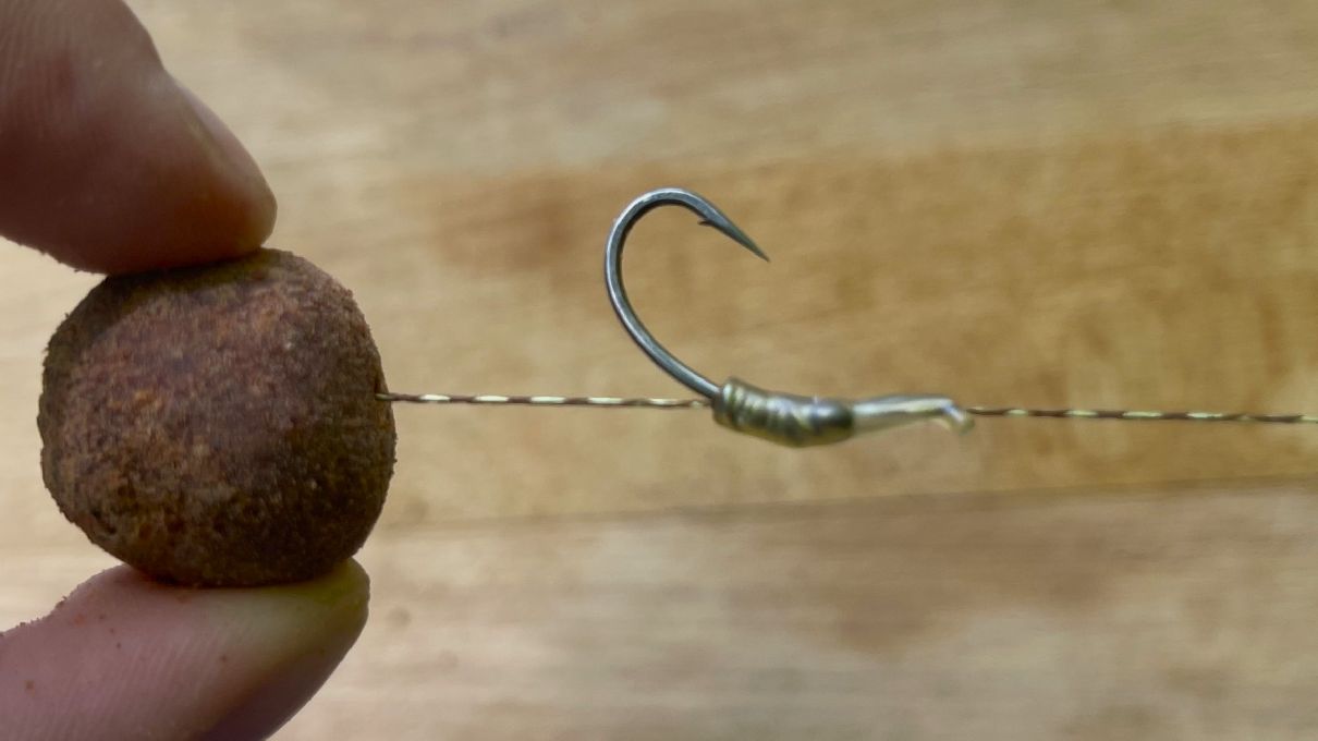 Potom háček umístíme do požadované vzdálenosti od kuličky. Pokud chce rybář chytat na větší nástrahy – například na boilies o velikosti 24 milimetr, a selektovat tak menší ryby, pak dá háček od boilies trochu dále.