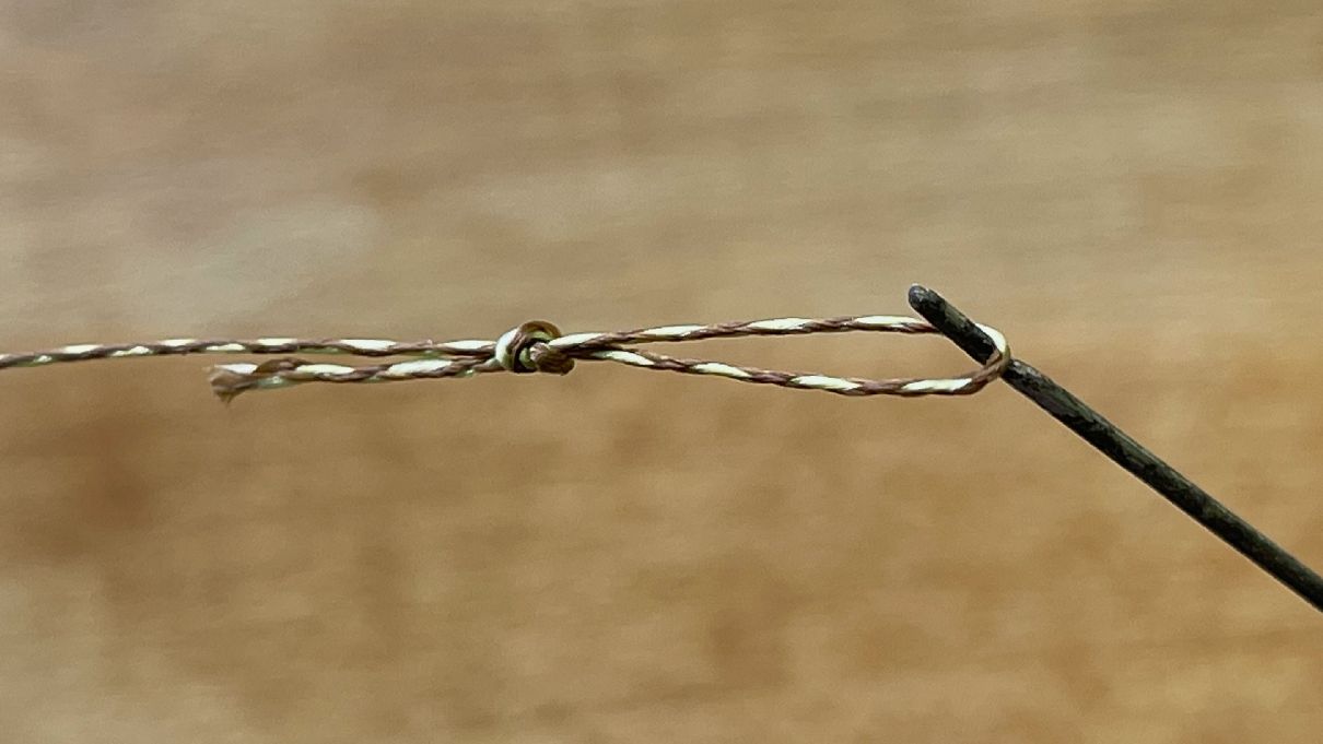 A nakonec šňůrku opět prostrčíme ZE ZADNÍ strany očka háčku. Tím tak bezuzlově přivážeme háček k měkké návazcové šňůrce, který na ni bude spolehlivě držet. Rybář se tak může stoprocentně spolehnout, že háček vydrží i ten nejsilnější tah ryby.