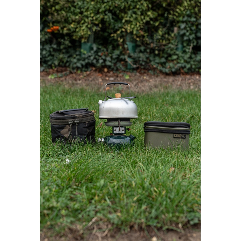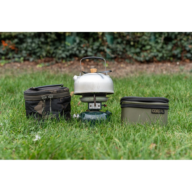 Pouzdro Compac Stove Bag je navrženo tak, aby bezpečně uskladnilo a chránilo většinu běžných jednoplotýnkových benzinových vařičů dostupných na trhu. Je vyrobeno z odolné 600D dark kamo tkaniny s vnitřní snadno čistitelnou podšívkou, má pevné víko se zipem a praktické držadlo na přenášení.
