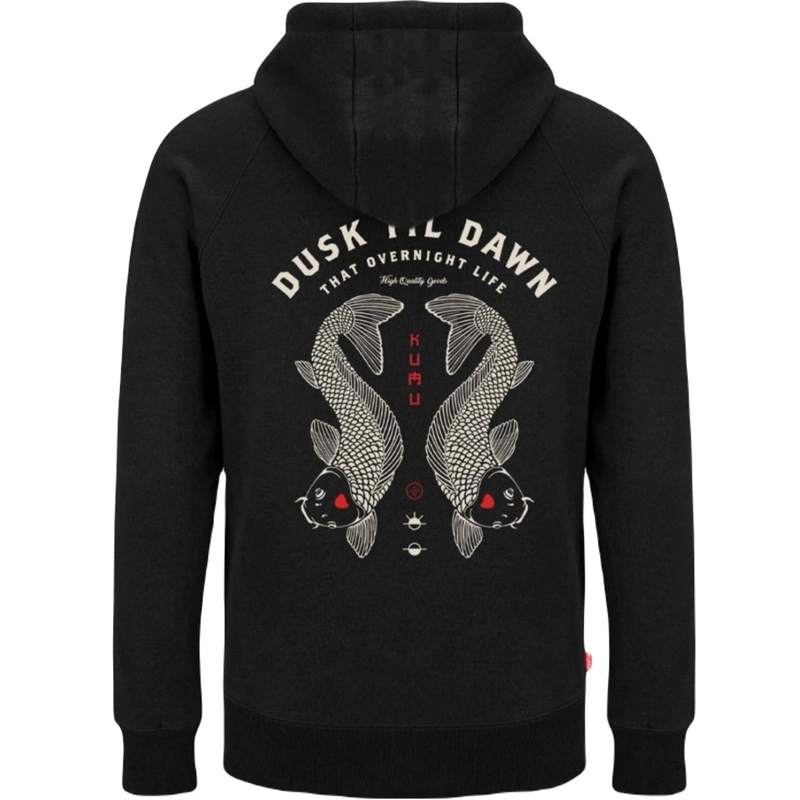 Po úspěchu motivu Dusk Till Dawn přichází tento ikonický design také na mikině. Kousek pro noční posádku a pro všechny, kteří milují lov od rána až do noci a pro které ani noční rybolov není překážkou. DUSK TILL DAWN v překladu znamená od úsvitu do soumraku. Ručně kreslená grafika v bílé a kontrastní červené barvě, vytištěná na luxusní látce o gramáži 320 g/m² s tkanými detaily na boční poutce.