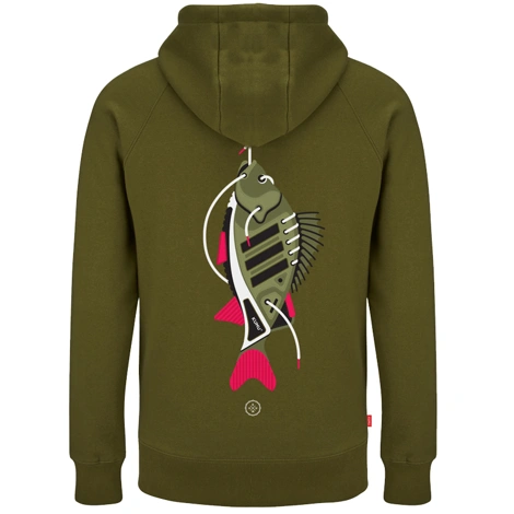 Mikina Earn Your Stripes je grafická pocta okounům („Stripeys“) a rybářské trpělivosti – motiv kombinuje pruhy ryby s narážkou na úspěch, který si musí rybář zasloužit. Vyrobena z mimořádně měkké khaki tkaniny o gramáži 150 g/m², s detailním šestibarevným sítotiskem a tkanými bočními štítky.