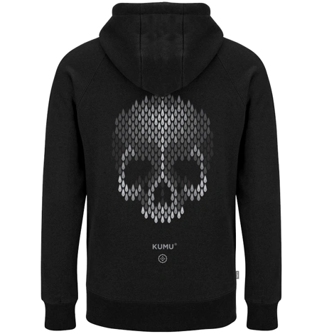 Pokud sledujete značku KUMU od samého začátku, možná si pamatujete tuto ikonickou grafiku z roku 2019. Motiv lebky je vytvořen z rybářských olov a zpracován v 3D gradientním efektu v chladných šedých tónech. Mikina je vyrobena z mimořádně měkké látky o gramáži 150 g/m² a doplněna o tkané poutko na boční straně.