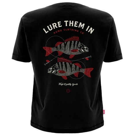 Pro věrné 699 Kč. Jak na to?Ručně kreslený motiv lákající pruhované tvory z hlubin ''Lure Them In,,. Dvoubarevný sítotisk (krémová a červená) na superměkké organické látce (150 g) s tkaným bočním štítkem.