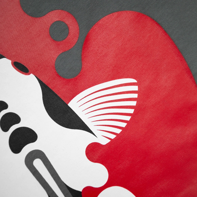 Jedna z nejoblíbenějších linií, nově dostupná v krásné břidlicově šedé barvě. Grafika vycházejícího slunce čerpá inspiraci z kultury a víry Dálného východu. Studium použití červené barvy v japonském umění a její význam, v kombinaci s obdivem ke kaprům Koi a jejich symbolice, vedlo k vytvoření této ikonické grafiky. Tříbarevný sítotisk na superměkké organické látce 150 g s tkaným bočním štítkem.
