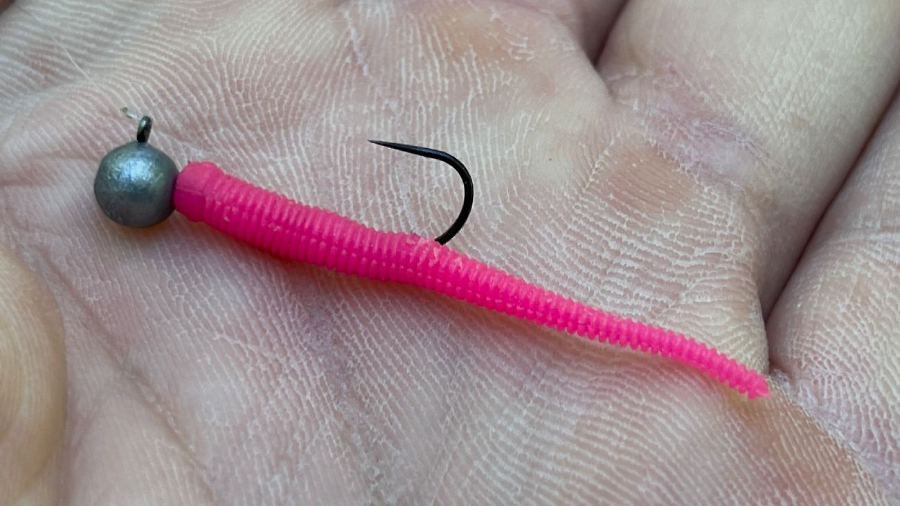 Takto výrazně zbarvená gumová nástraha na pstruhy málokdy zklame!