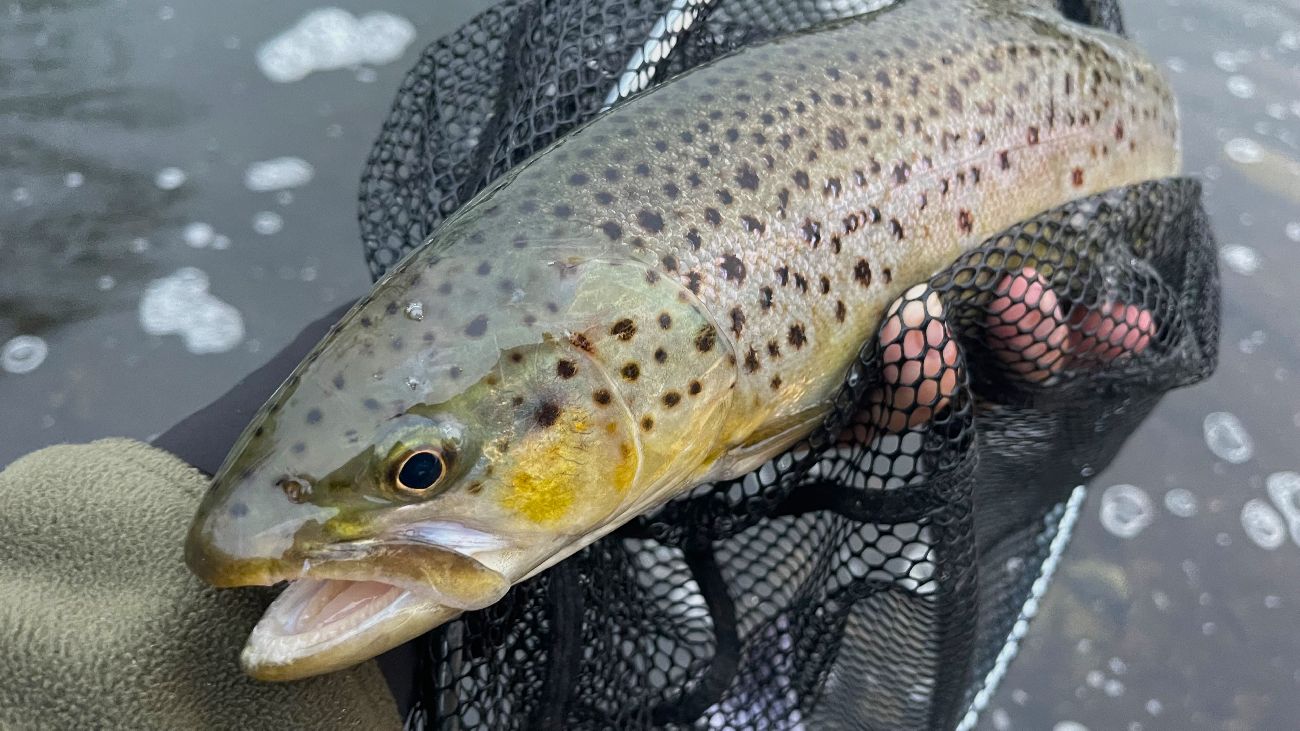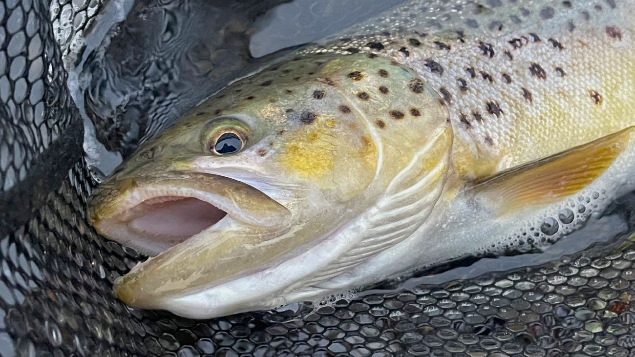Nádherný pstruh ulovený na pomalu vedenou nástrahu v blízkosti dna