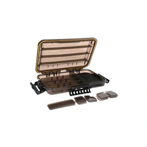 Jednostranné, 100% vodotěsné, černé rybářské krabičky s těsněními. Dolní oddíly byly vybaveny speciálně vyříznutou pěnou. Mají také klasické nastavitelné přihrádky bez pěny pro uložení nejrůznějších nástrah.