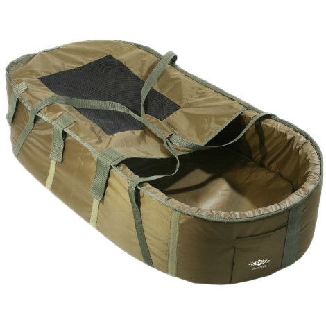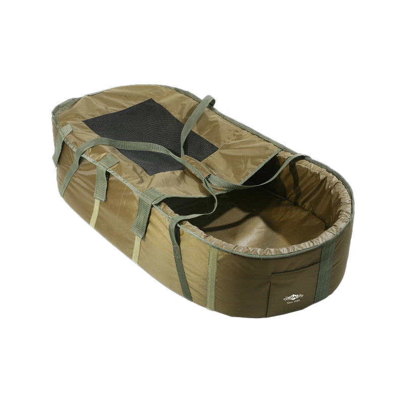 Profesionální kaprová podložka typu vanička s vysokými, měkkými a silnými stěnami, odtoky vody a vyjímatelnými matracemi pro snadný transport.