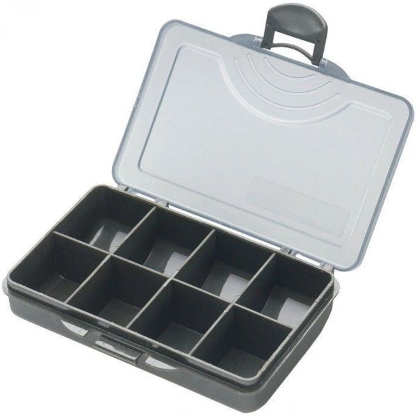 Praktická kaprařská krabička firmy Mivardi je určena na drobné rybářské příslušenství. Má osm oddělených přihrádek a je vyrobena z odolného plastu.