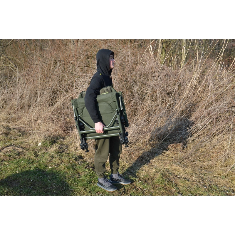 Jeho velkou výhodou je miniaturní kloub umožňující nastavení sklonu opěradla. Pevné opěrky rukou s neoprenovým potahem zvyšují celkovou pevnost křesla a zároveň jsou velmi pohodlné. Na křesle jsou použity nejkvalitnější typy zámků výsuvu nohou i patek proti zaboření. Přes nízkou hmotnost a malé přepravní rozměry se jedná o plnohodnotné křeslo, vhodné i pro dlouhodobé sezení.