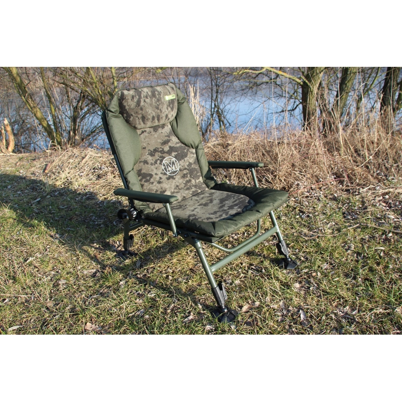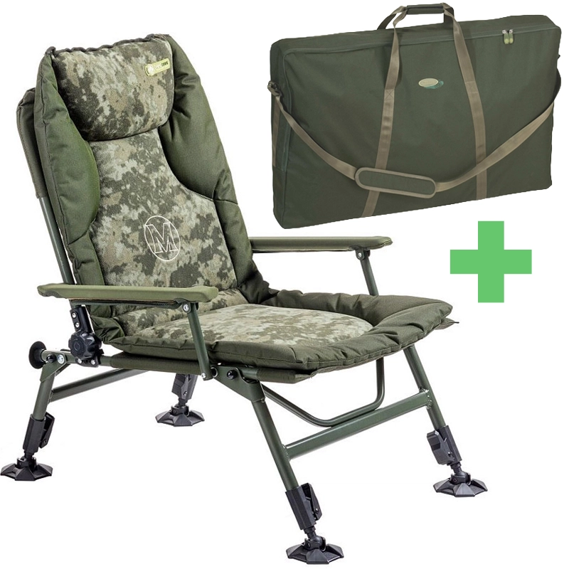 Set ultralehkého křesla Mivardi CamoCODE Arm z materiálu Duralite s polstrovanou matrací a transportní taškou nabízí vysoký komfort i snadné přenášení.