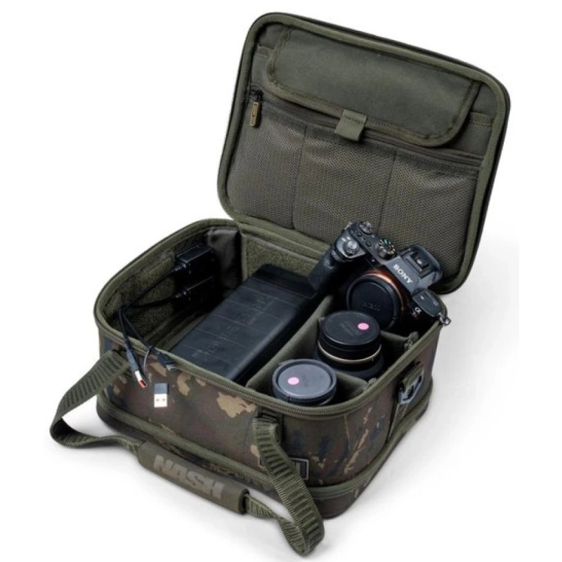 - Díky pevné konstrukci poskytuje maximální ochranu pro tablety do 10" (25 cm), velké powerbanky, například Nash Powerbanx 80k, a profesionální foto či video vybavení.