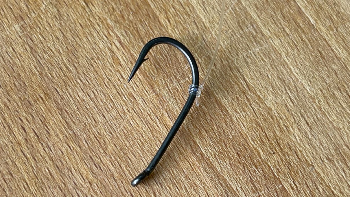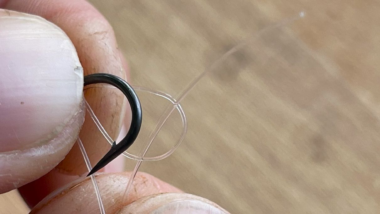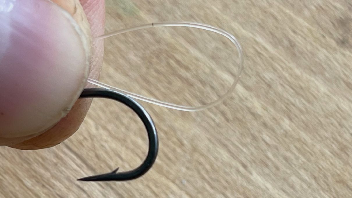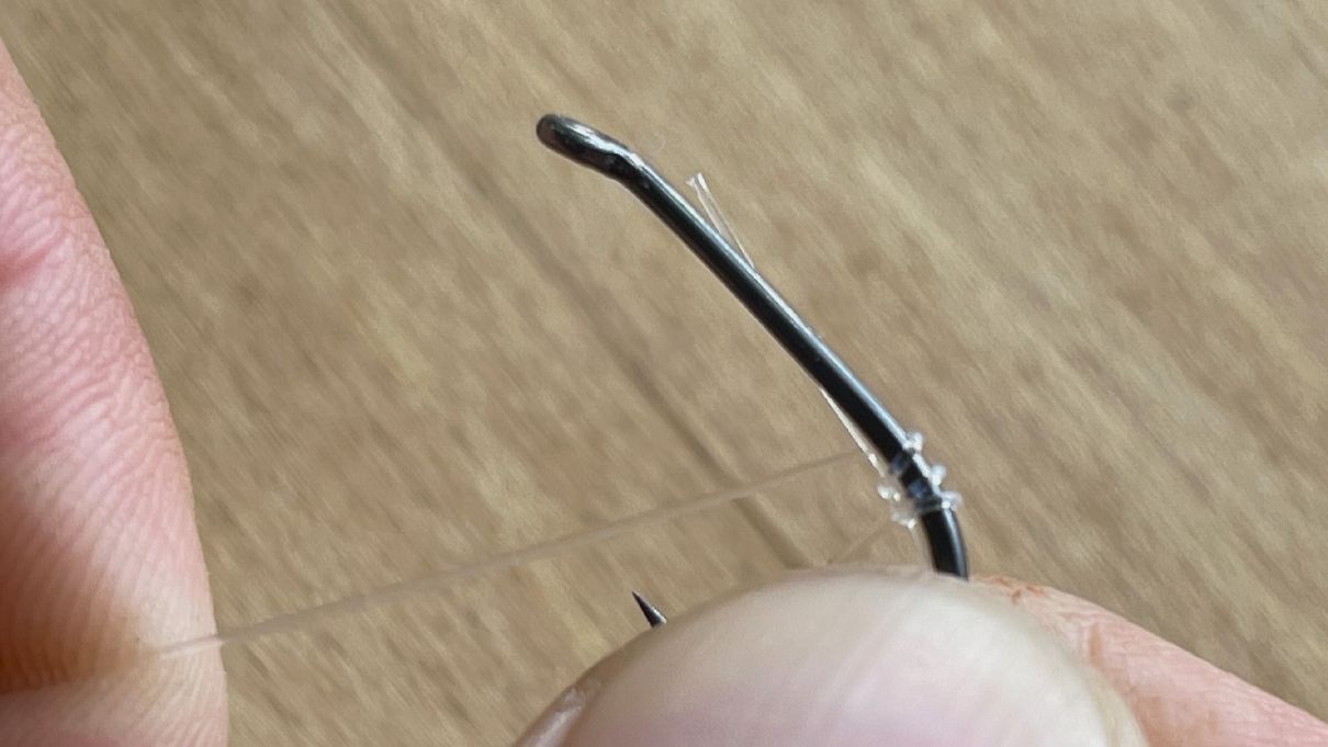 Pojďme se už podívat na samotné vázání návazce z fluorocarbonu. Jak začít? Jelikož v tomto případě z tohoto materiálu budeme vázat extra účinný návazec na kapry D-Rig, tak v prvé řadě musíme na obloučku háčku navázat takový uzel, který se váže na háčcích s lopatkou.