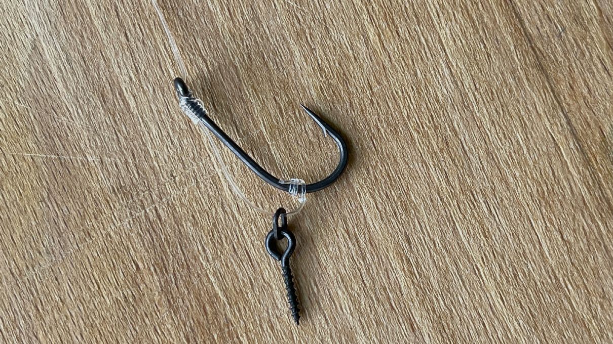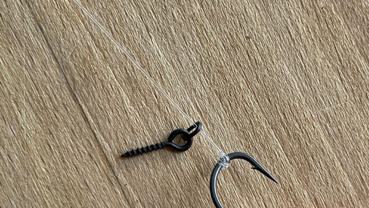 Ve chvíli, kdy máme vrut nebo kroužek navléknutý, tak následně navážeme bezuzlovým vázáním háček na kapry. Jestli nevíte, jak se takový háček na boilies váže, pak se podívejte na článek Jednoduchý návazec na boilies: rychlý návod na návazec na kapry, ve kterém je podrobný návod vázání takového háčku.