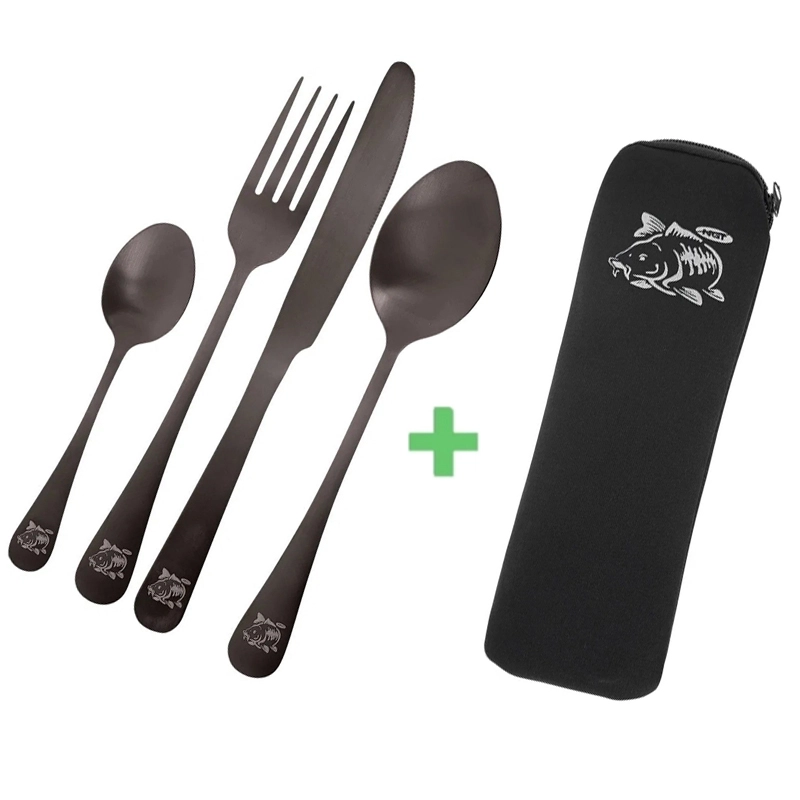 Tato sada kombinuje odolnost, pohodlí a moderní design. Každý kus je vyroben z nerezové oceli s matným food-grade povrchem a zdoben logem kapra, což ocení každý kaprař.