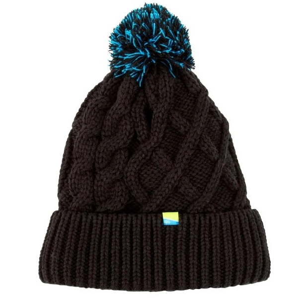 Pletená čepice s bambulí v černé barvě s akcentem modro/černé bambulky.