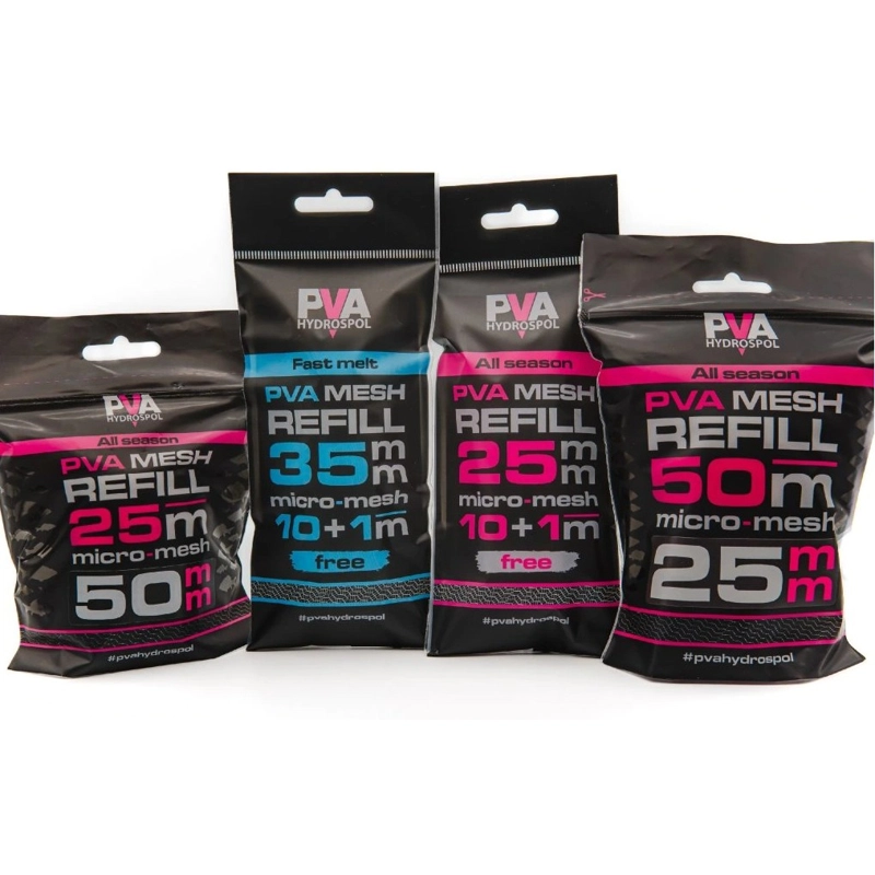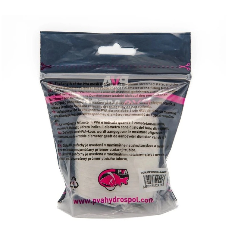 Hustý micro-mesh materiál All Season punčochy je vhodný pro plnění jemnými návnadovými směsmi, drceným boiliesem i drobnými peletami, aniž by obsah propadával skrz úplet. Náhradní PVA punčocha slouží k doplnění PVA materiálu na plnící tubus. Varianta 35 mm je pletená z 36 kvalitních PVA vláken. Praktické balení 25 m je dodáváno v uzavíratelném zip sáčku, který chrání materiál před navlhnutím a usnadňuje skladování i opakované používání během rybolovu. Rychlost rozpouštění závisí na teplotě vody. Řada All Season je vhodná pro celoroční použití v teplé i studené vodě. Použité návnady nesmí obsahovat vodu, protože při kontaktu s ní dochází k postupnému rozpouštění materiálu. Dlouhodobé dipování předem může způsobit zakonzervování vláken, což může ovlivnit správnou rozpustnost materiálu. Délka PVA punčochy je uvedena v maximálním nataženém stavu a uvedený průměr značí doporučený průměr plnícího tubusu.