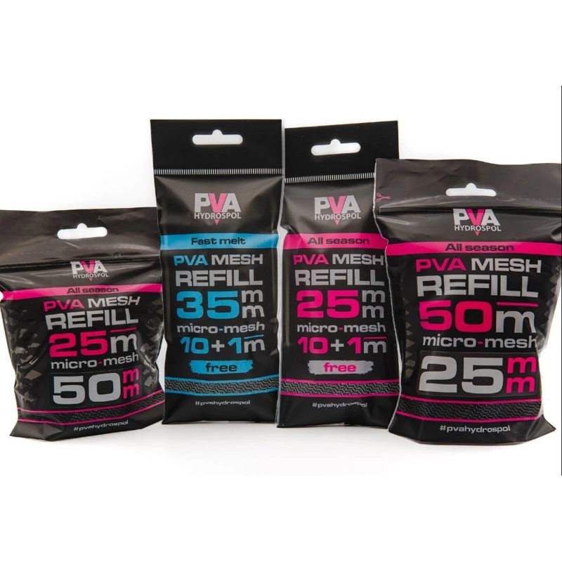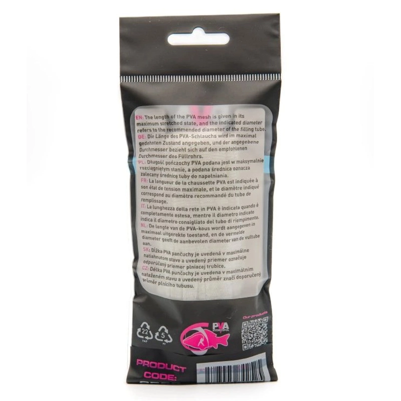 Jemný micro-mesh materiál punčochy je vhodný pro plnění jemnými návnadovými směsmi, drceným boiliesem i drobnými peletami, aniž by obsah propadával skrz úplet. Náhradní PVA punčocha slouží k doplnění PVA materiálu na plnící tubus. Varianta 25 mm je pletená z 24 kvalitních PVA vláken. Fast Melt provedení je ideální pro použití v chladnější vodě, kde rychlejší rozpustnost podporuje správnou funkci materiálu. Díky speciálnímu úpletu je punčocha zároveň vhodná i pro použití v teplejší vodě během celé sezóny. Použité návnady nesmí obsahovat vodu, protože při kontaktu s ní dochází k postupnému rozpouštění materiálu. Dlouhodobé dipování předem může způsobit zakonzervování vláken, což může ovlivnit správnou rozpustnost materiálu. Délka PVA punčochy je uvedena v maximálním nataženém stavu a uvedený průměr značí doporučený průměr plnícího tubusu.