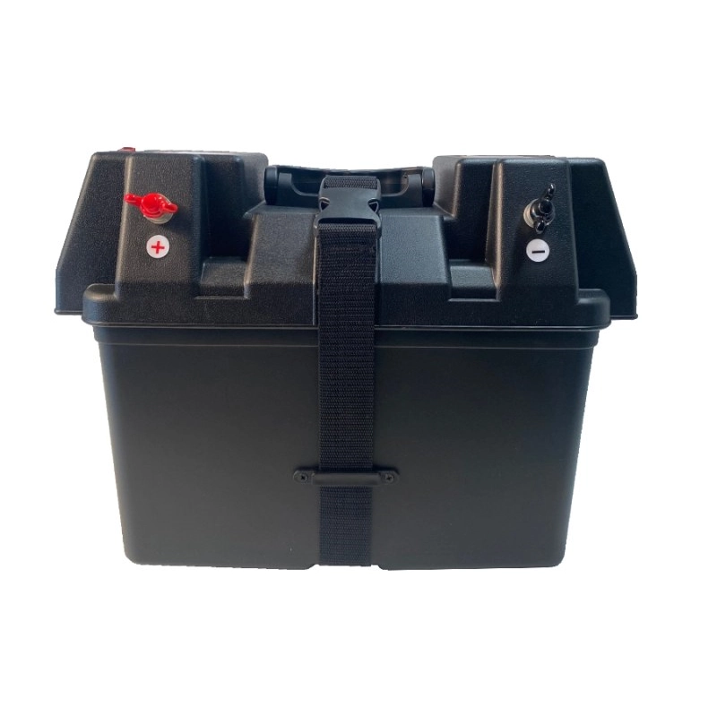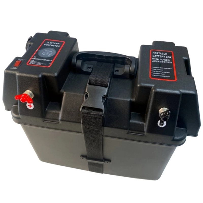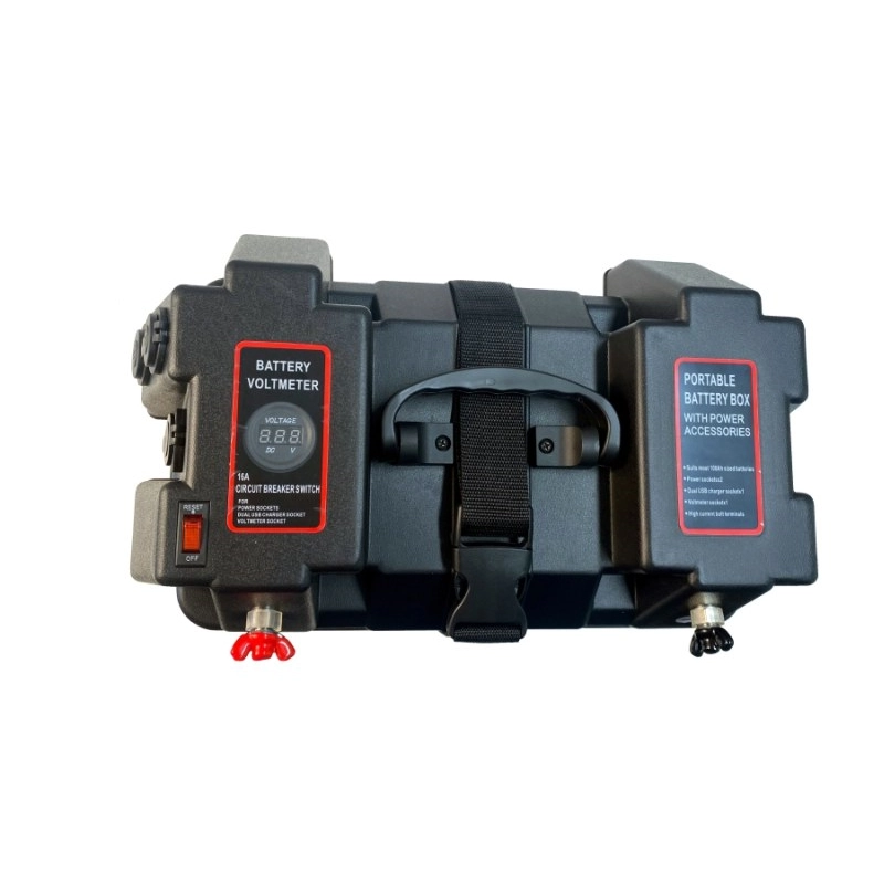 Praktický box pro akumulátory 12V do 100Ah s kabeláží, svorkami a zásuvkami 12V a USB.