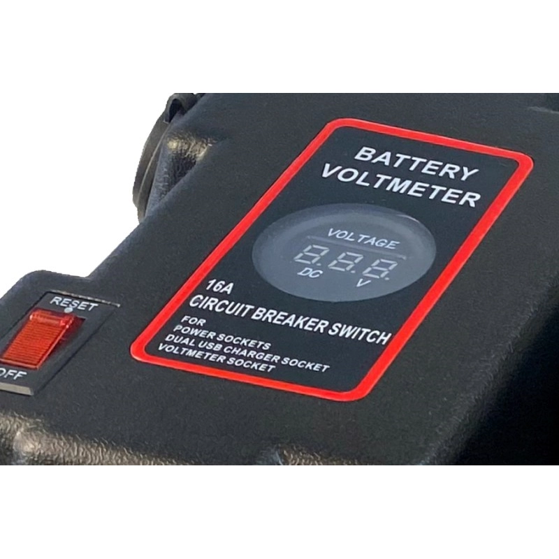 - 2× autozásuvka 12V napojená na baterii přes vypínač s jističem 16A