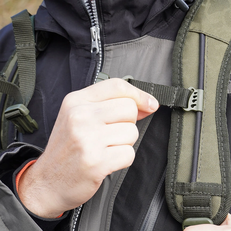 Držák na vidličky – Dva držáky na vidličky připevněné k zadní straně jsou vhodné nejen pro snadnou přepravu. Díky stabilitě batohu je lze také použít přímo jako držák prutů na krátké rybolovné výpravy.