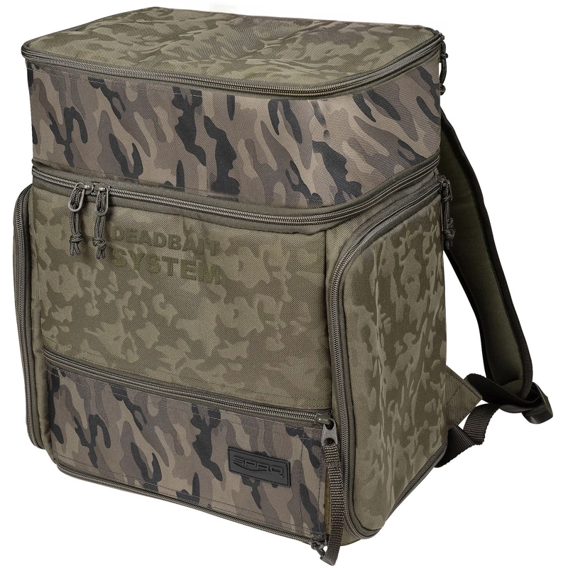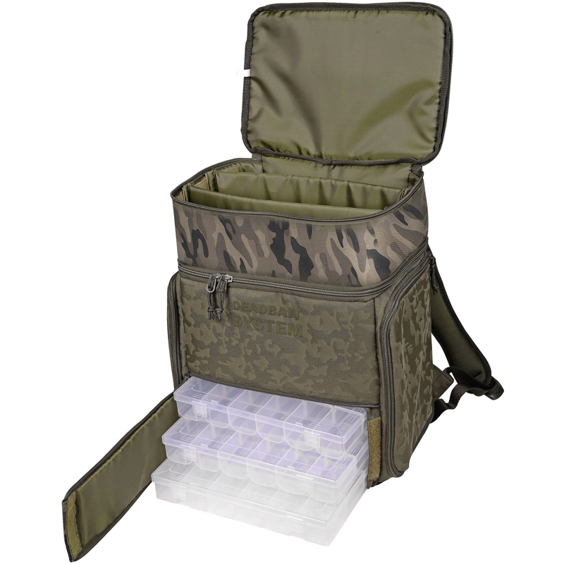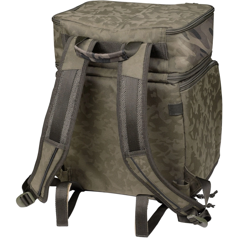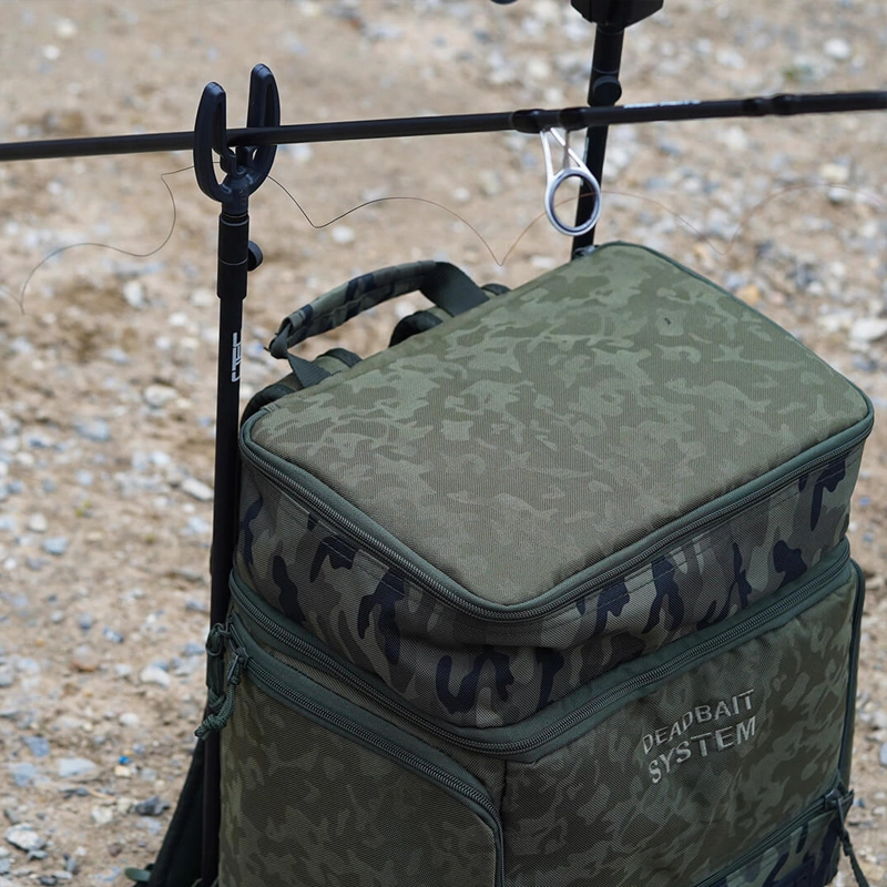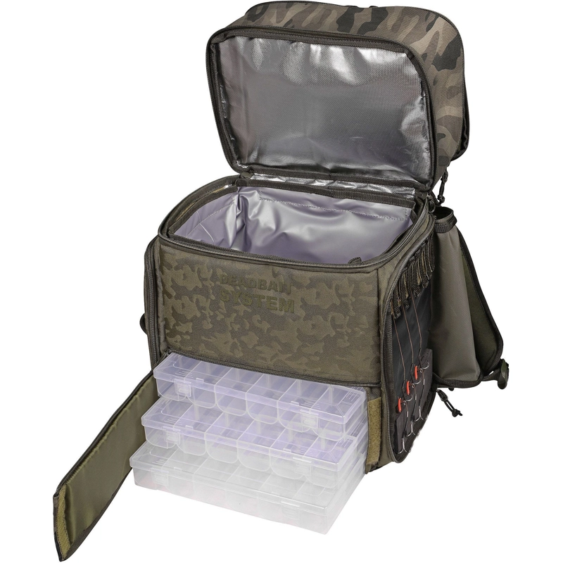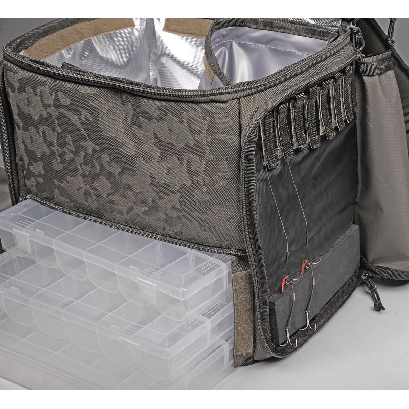 Spodní část batohu s dvojitou a snadno přístupnou přihrádkou na zip obsahuje 3 boxy na rybářské náčiní. Prostřední část zahrnuje chladicí tašku pro uložení nástražních ryb se snadno čistitelným a odnímatelným interiérem. Horní část má dvě individuálně nastavitelné přepážky se suchým zipem a přihrádka nabízí dostatek místa pro dlouhé splávky, olova nebo jiné drobnosti. Boční kapsy jsou ideální na montáže, návazce a koncové náčiní. Dva držáky na vidličky připevněné na zadní straně jsou vhodné nejen pro snadnou přepravu. Díky stabilitě batohu je lze také přímo použít jako držák prutů na krátké rybolovné výpravy.