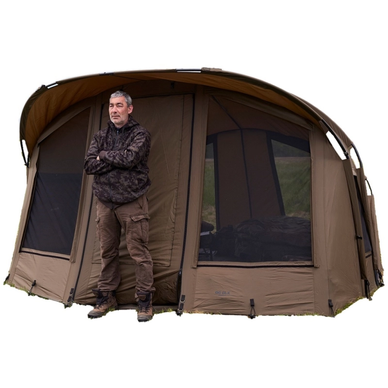 Obrovský bivak pro dva rybáře a dvě lehátka s velkým kšiltem proti dešti a slunci. Extra prostor na velké množství vybavení. Díky jeho výšce se v něm pohodlně postavíte.