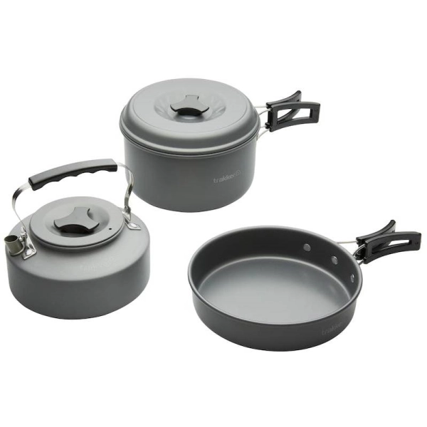 Sada nádobí, která zahrnuje hrnec s pokličkou, pánvičku a konvičku, které díky skládacím držadlům nezaberou téměř žádné místo v tašce.