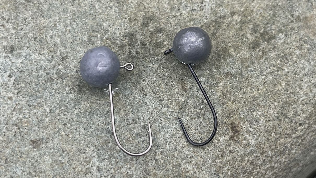 Porovnání jigových hlav: vlevo vidíte jig s háčkem s protihrotem, vlevo je pak jig s háčkem bez protihrotu