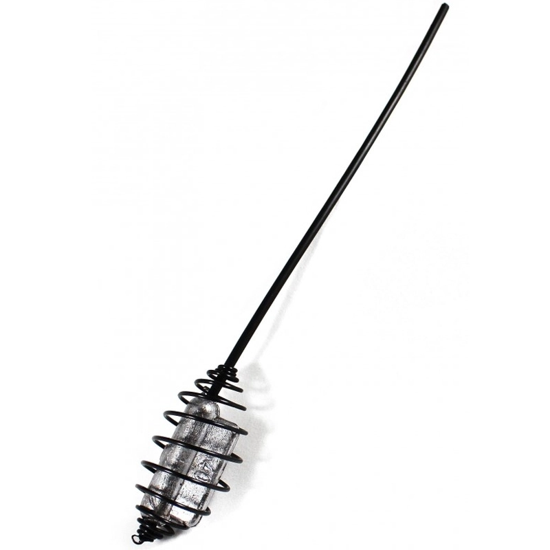 Krmítko průběžné s excentrickým olovem a dlouhou trubičkou. Excentrické olovo zabraňuje kroucení vlasce a dlouhá trubička brání zamotání při náhozu.