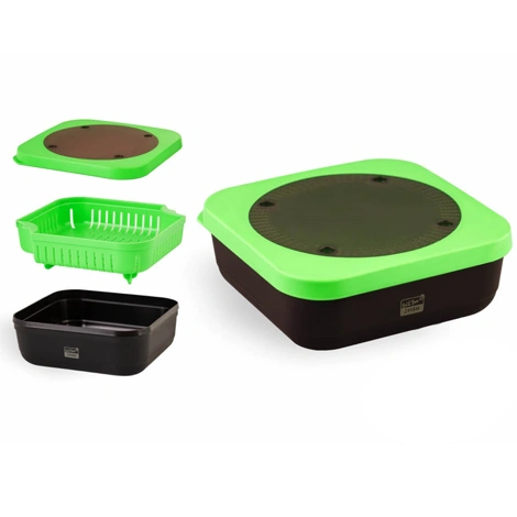 Box má perforované víko, je proto ideální pro živé nástrahy (červy, žížaly), které tak dostávají přísun vzduchu.